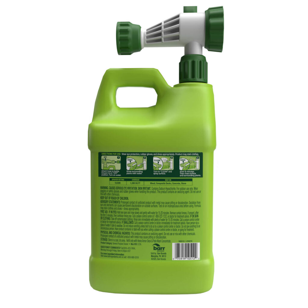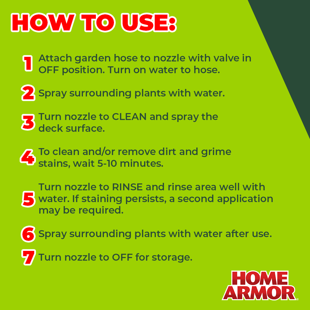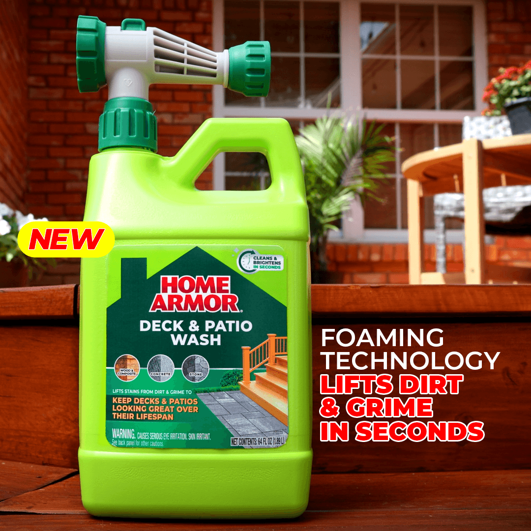 Lift stains from dirt and grime to keep decks and patios looking great with Home Armor Deck & Patio Wash. This outdoor deck wash cleans and brightens a variety of different surfaces in seconds. For outdoor use only, it is ideal for use on wood and composite, concrete, and stone. To lift stains from dirt and grime, spray solution onto surface, wait 10 minutes, and rinse surface thoroughly with water. Read and follow all label directions to avoid surface damage. Safe for use around plants when used as directed. Rinse surrounding plants with water before and after use. Keep away from children and follow all directions carefully.